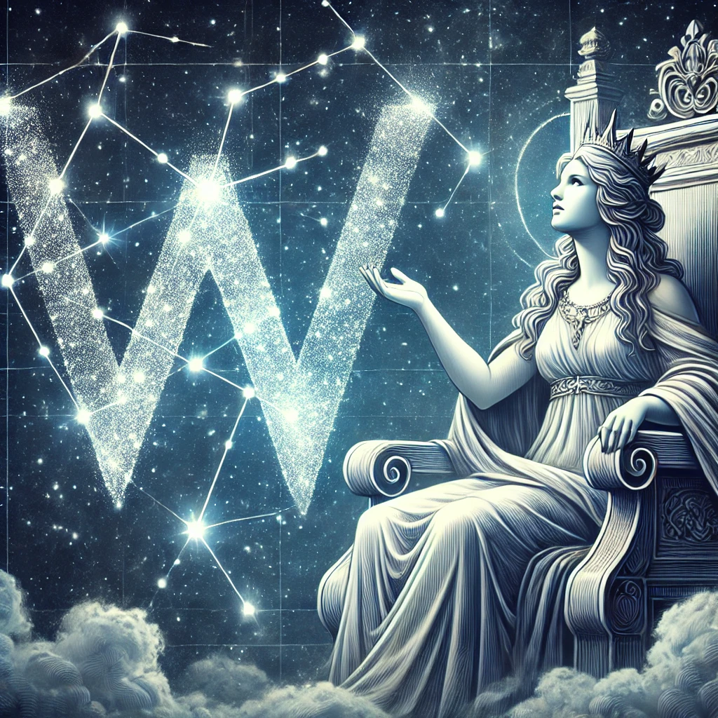 카시오페이아자리는 하늘에서 W 모양으로 보이며, 왕비가 거꾸로 앉아 있는 모습을 상징합니다. 이는 그녀의 자만심과 그로 인해 받은 벌을 보여줍니다. 세페우스자리는 그녀 옆에 위치하며 왕으로서의 책임을 상징합니다.